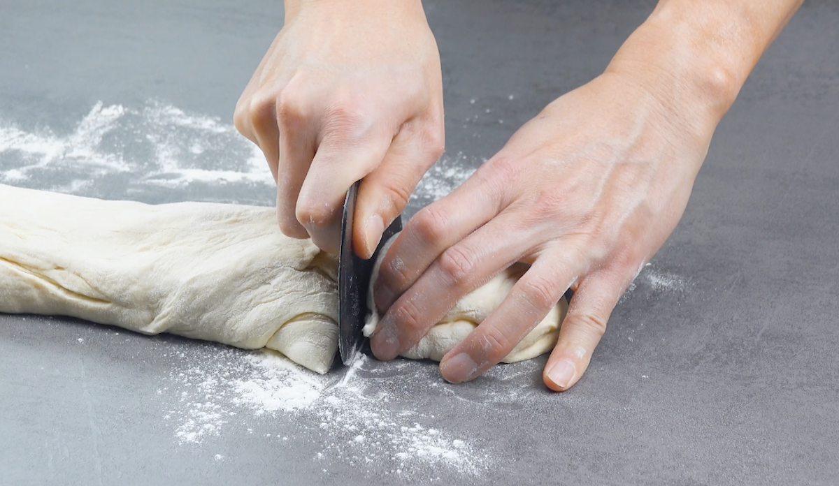 3. Verteile Mehl auf deiner Arbeitsfläche und forme den Teig zu einem länglichen Stück. Schneide dieses längliche Stück in 6 bis 7 kleine Stücke.