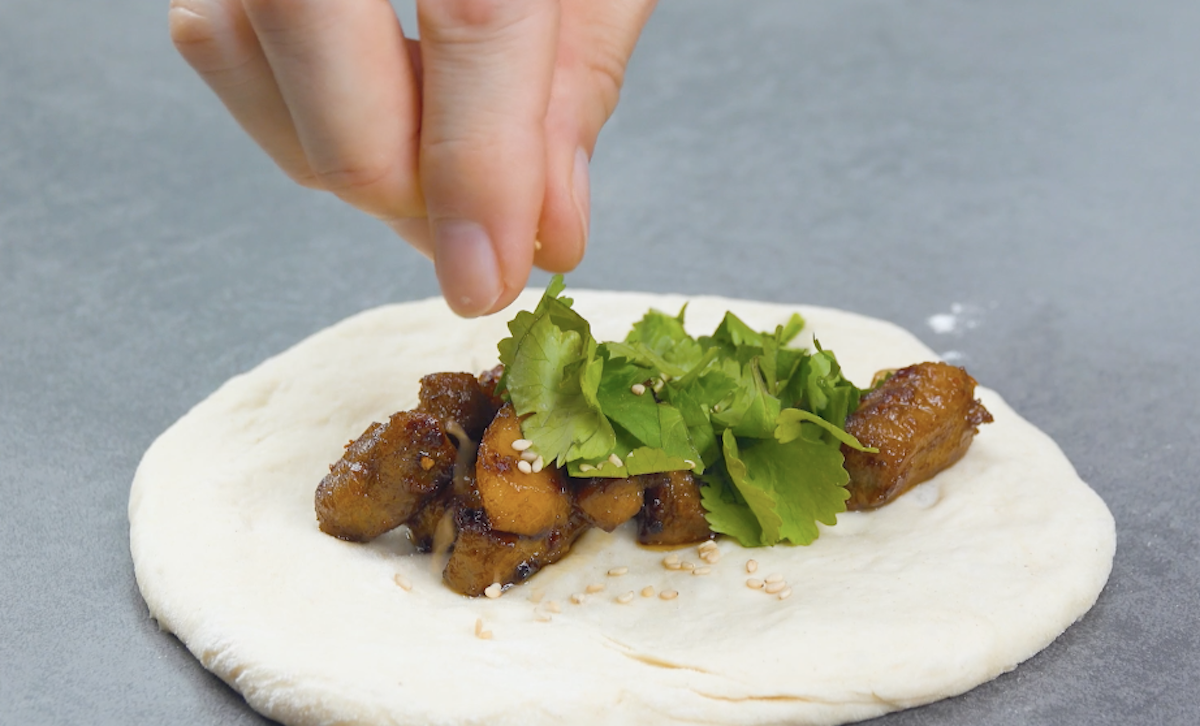 4. Forme aus den Teigstücken kleine runde Fladen und belege diese mit dem angebratenen Fleisch, frischem Koriander und Sesam.