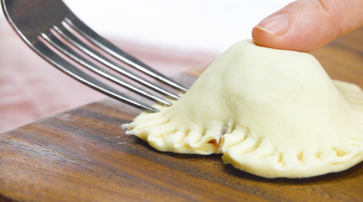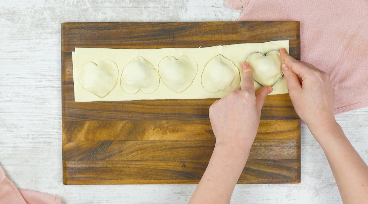 1.4 Entferne den restlichen Blätterteig und drücke die Ränder der Herzen mit einer Gabel an.