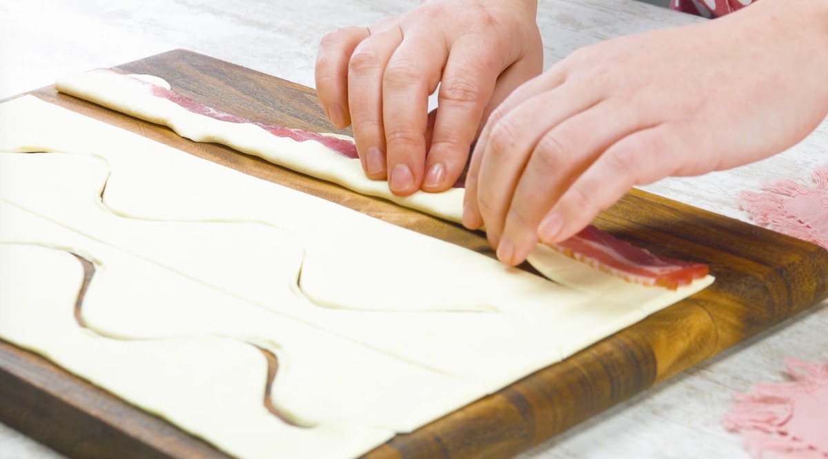 3.3 Lege zwei Streifen Speck auf die erste Welle und klappe den Blätterteig über dem Speck zusammen.