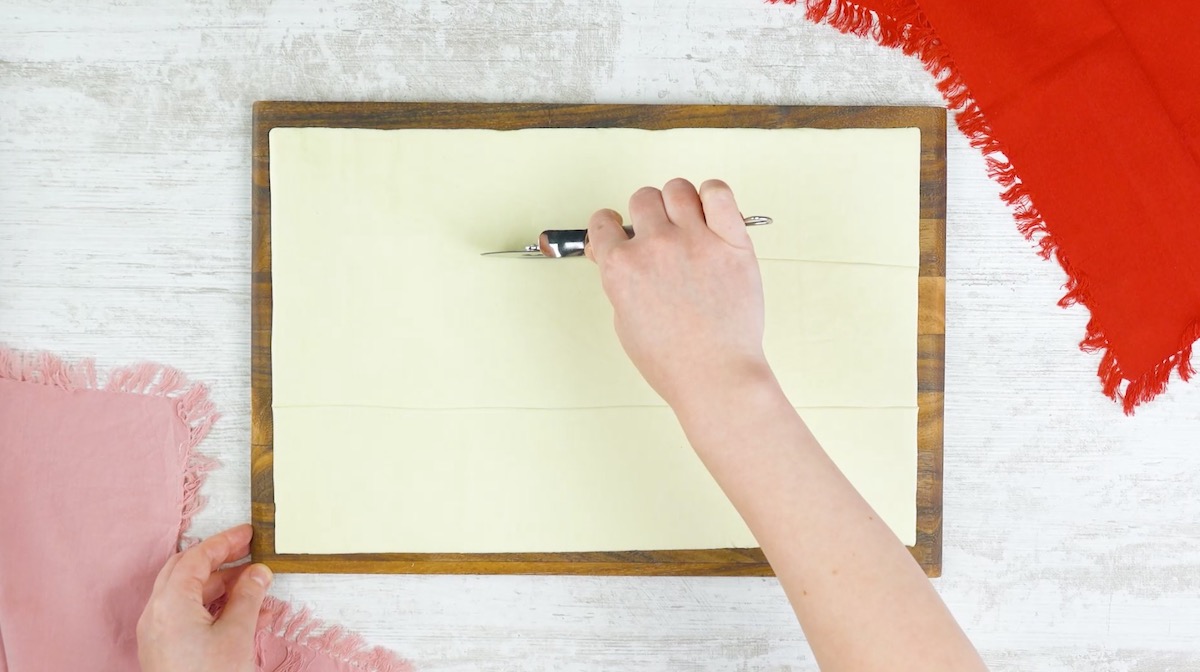 3.1 Rolle den Blätterteig aus und schneide ihn der Länge nach in drei gleich breite Streifen.