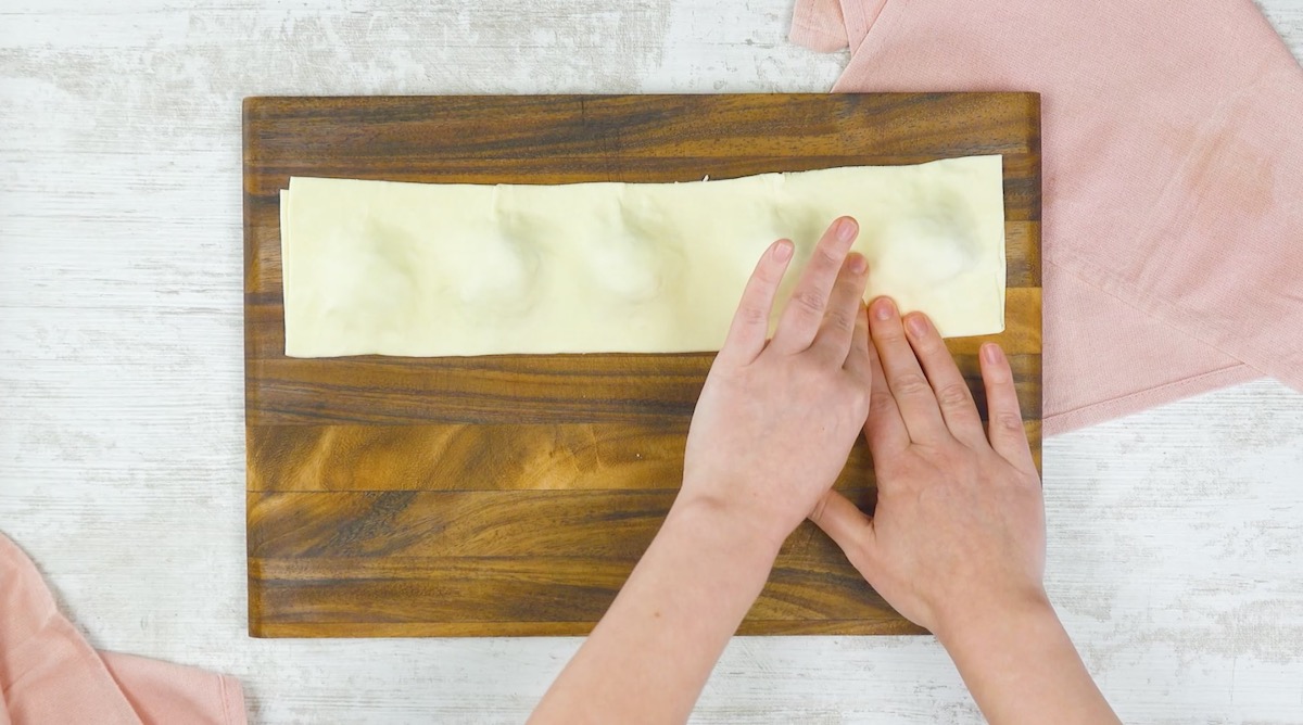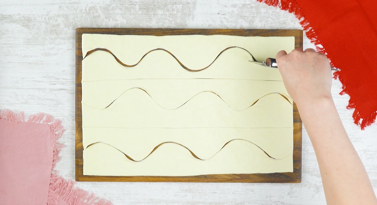 3.2 Schneide die Blätterteigstreifen nun mit einem Pizzaroller der Länge nach wellenförmig durch, sodass sechs gewellte Streifen entstehen.