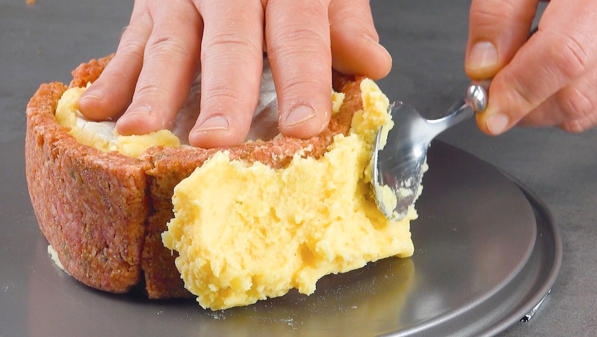 Wird ein mehrlagiger Kuchen serviert, liegen die Schichten eigentlich übereinander. Doch ein Kuchen lässt sich auch schichten, indem die verschiedenen Lagen sich gegenseitig umhüllen. Am besten funktioniert das mit einem herzhaften Kuchen – unser Exemplar vereint würziges Hackfleisch mit einem aromatischen Kartoffel-Brandteig und überrascht in der Mitte mit einem geschmolzenen Kern aus Camemberts.