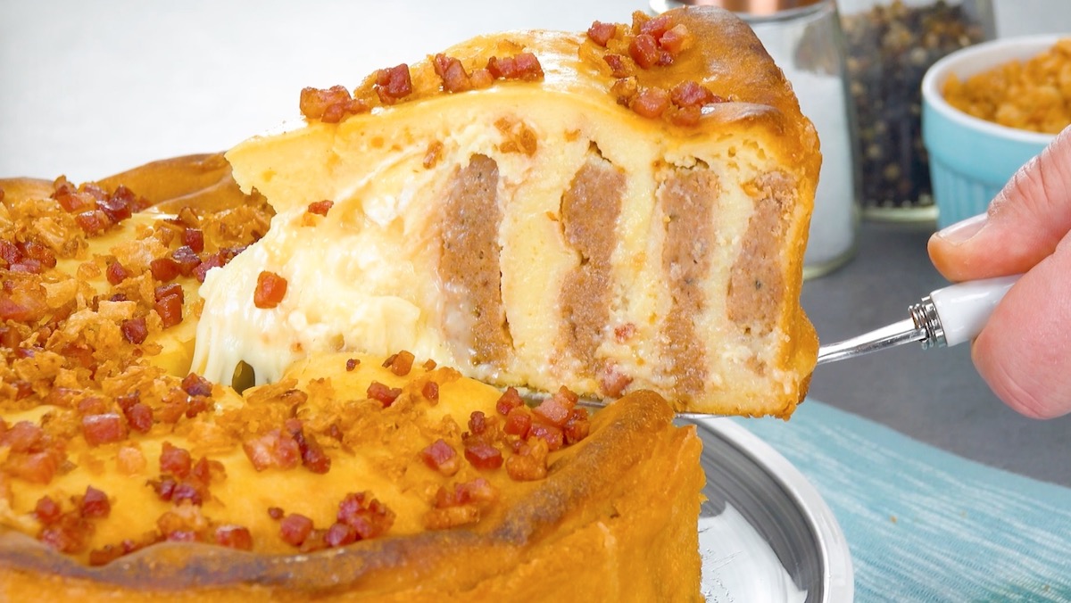 10. Backe den herzhaften Kuchen für 120 Minuten bei 160 °C Umluft. Serviere ihn, garniert mit Röstzwiebeln und angebratenem Bacon.