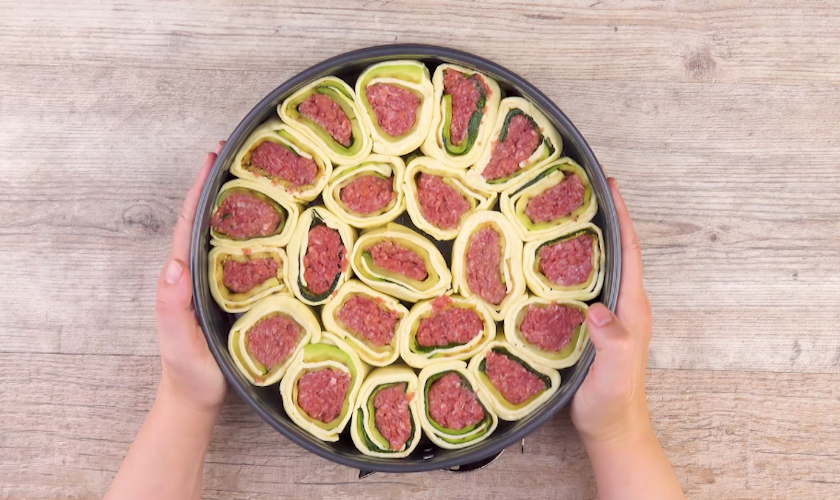 5.) Diese Scheiben setzt du nun hochkant nebeneinander in eine Springform. Fange von außen an und arbeite dich nach innen vor. Schiebe den Zucchini-Röllchen-Kuchen nun bei 170 °C im Umluftmodus für ca. 30 Minuten in den Ofen.