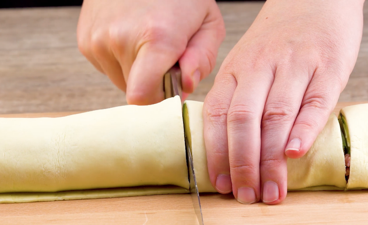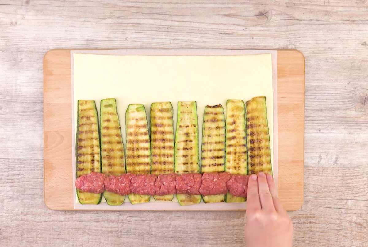 2.) Lege sie nun hochkant entlang der Längsseite auf den ausgebreiteten Blätterteig. Am oberen Ende des Teigs sollten noch einige Zentimeter frei bleiben.