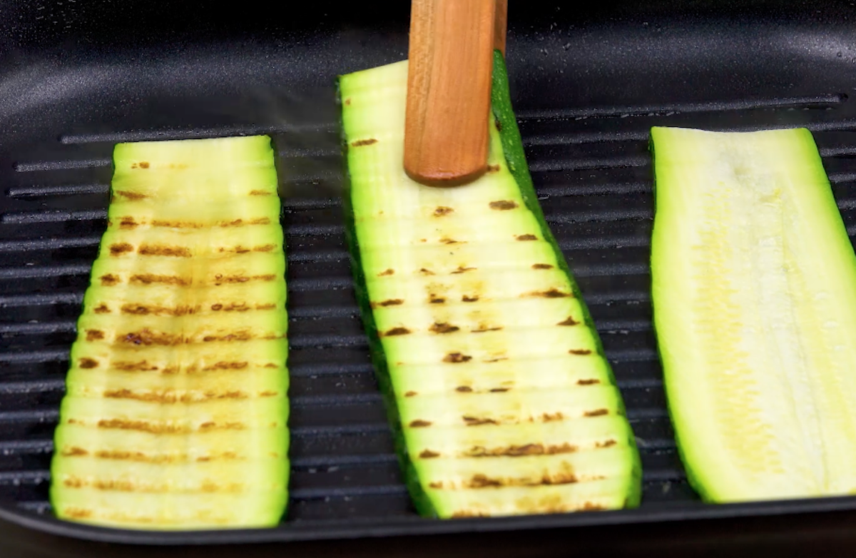 So geht es: 1.) Schneide für die Röllchen zunächst die Zucchini längs in ca. 2 bis 3 mm dicke Scheiben und röste sie in einer Pfanne von beiden Seiten an.