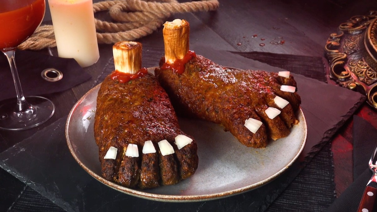 Gruseliges Halloween-Rezept: zwei Füße aus Hackfleisch