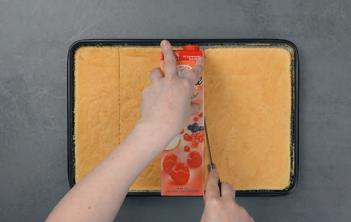 5. Fülle den Himbeer-Johannisbeer-Apfelsaft in ein Glas. Benutze den leeren Tetra Pak als Schablone für den Biskuitboden: Schneide diesen mithilfe des Tetra Paks in 5 gleich breite Streifen.