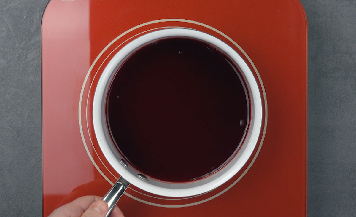 8. Gib den Rest des Saftes in einen Topf, erwärme ihn und lasse ihn für etwa 2 Minuten einreduzieren. Nimm den Topf von der Herdplatte und rühre die restliche Marmelade unter. Weiche die Gelatine in kaltem Wasser ein und drücke sie dann aus. Sobald der Saft im Topf etwas abgekühlt ist, gib die ausgedrückte Gelatine hinzu und rühre sie unter. Lasse alles noch weiter abkühlen.