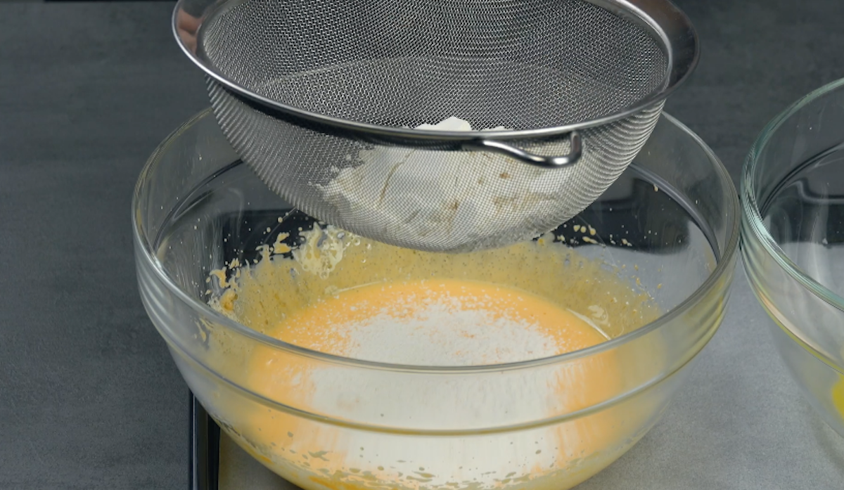 1. Trenne als Erstes die Eier. Schlage Eigelb mit Zucker und Öl auf. Siebe dann Mehl hinzu und vermenge nochmals alles mit einem Löffel.