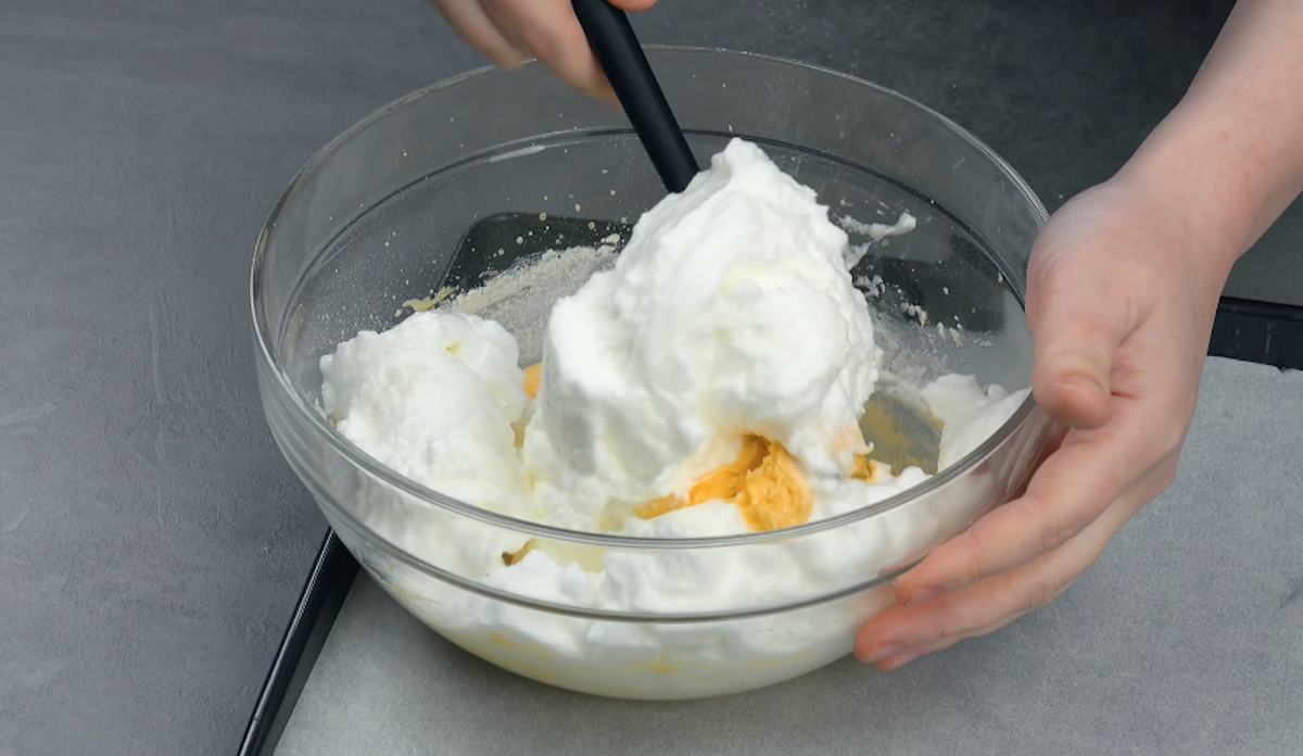 2. Gib Salz zum Eiweiß und schlage dieses mit einem Handrührgerät auf. Hebe ca. die Hälfte des Eischnees unter die Eigelbmasse und vermenge alles vorsichtig miteinander. Gib dann den restlichen Eischnee hinzu.