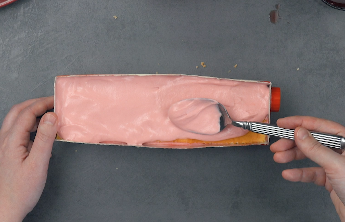 7. Lege nun einen Streifen des Biskuitbodens in den Tetra Pak und bepinsle ihn leicht mit dem Saft. Dadurch wird der Boden schön saftig und bekommt eine leicht rote Farbe. Verteile auf dem Boden ca. 1/5 der Himbeercreme. Dann verteilst du noch einen Esslöffel Himbeermarmelade auf der Creme. Wiederhole alles, bis der letzte Biskuitboden mit der Himbeercreme bestrichen wurde. Stelle das Schichtdessert in der Zeit kalt, in der du – im nächsten Schritt – das Himbeergelee zubereitest.
