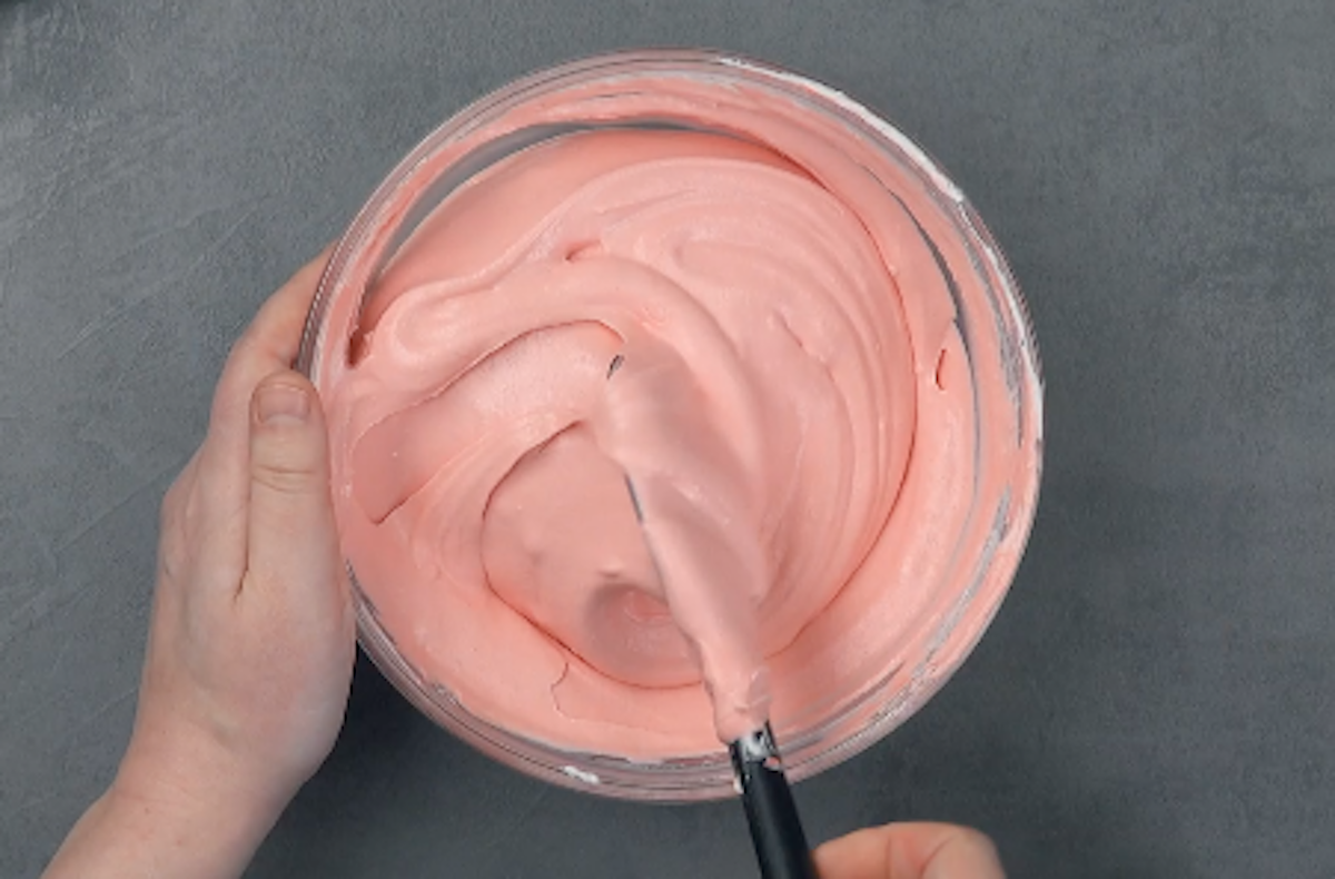 4. Als Nächstes wird die Himbeercreme zubereitet. Gib Frischkäse mit Marmelade in eine Schüssel, verrühre alles gut miteinander und hebe die geschlagene Sahne unter. (Schlage die Sahne am besten mit San-apart auf, so wird die Creme schön fest.)