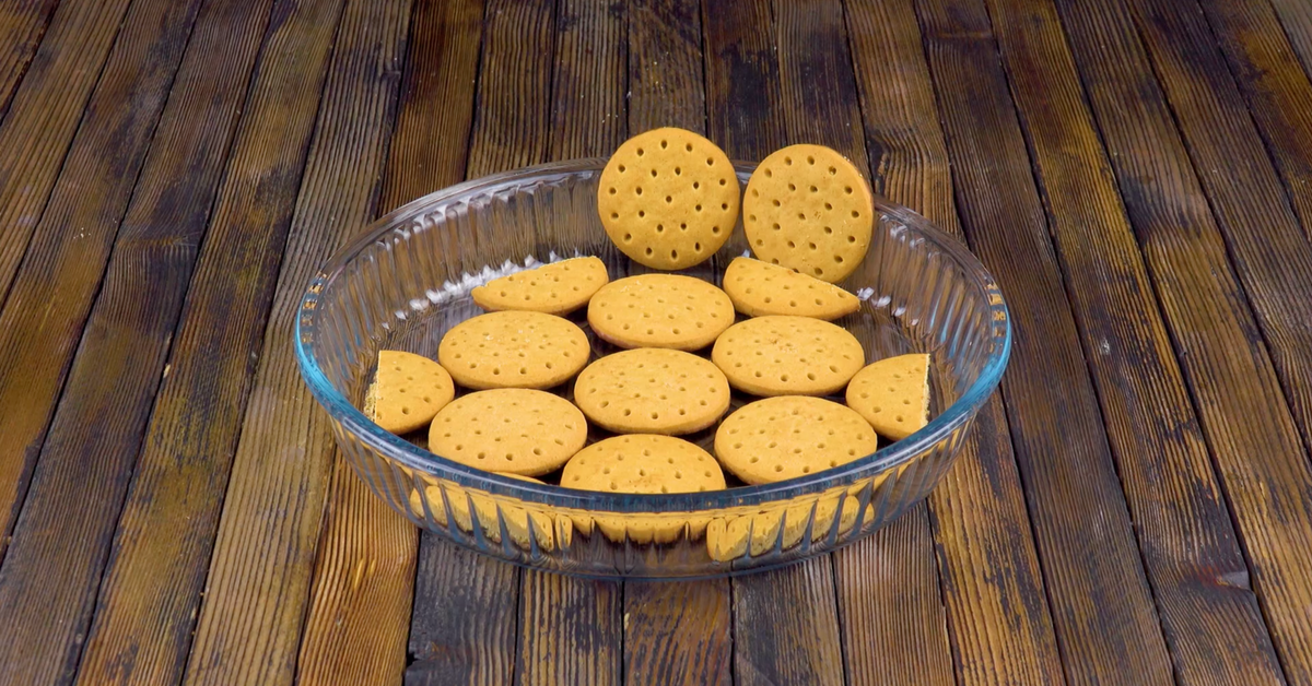 Lege eine Quicheform mit runden Keksen aus und bestreiche sie mit Creme.