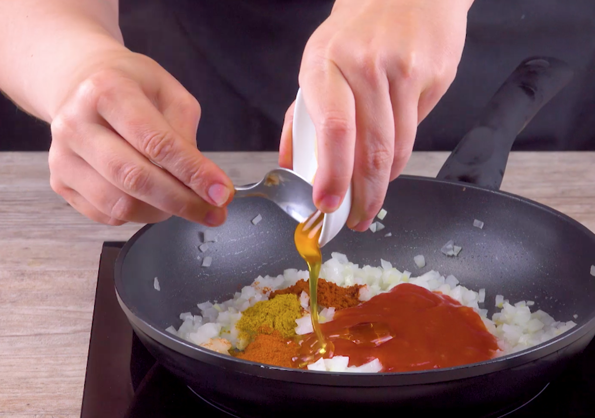 2.) Würfle das Innere der Zwiebel und schwitze es in etwas Öl an. Gib Ketchup, Paprikapulver, Currypulver, Cayennepfeffer und Honig dazu und mische alles.