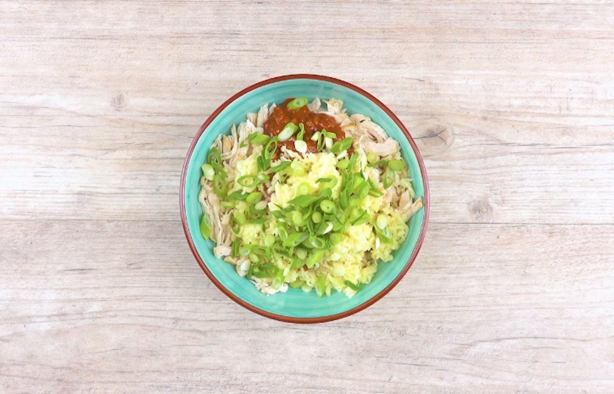 3.) Gib die Soße auf die gezupfte Hähnchenbrust, außerdem Mozzarella und Frühlingszwiebeln.