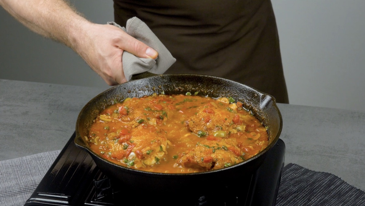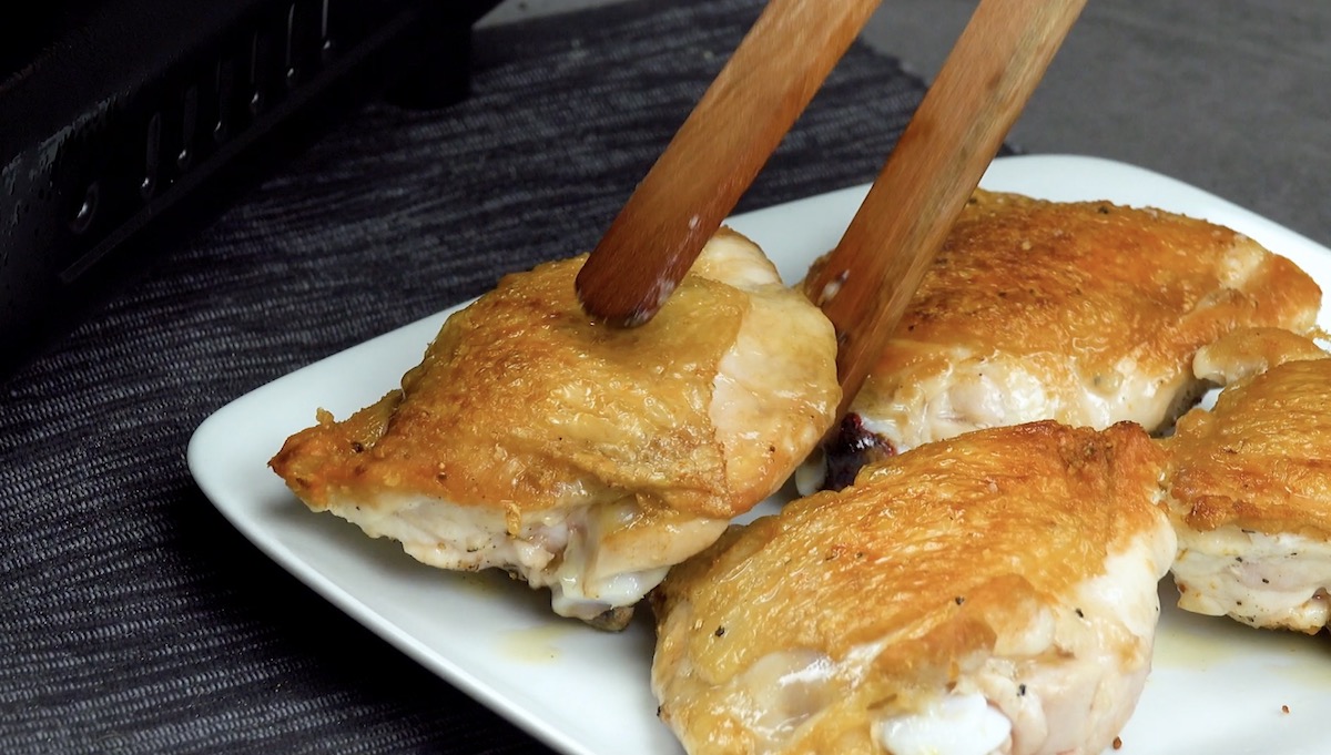 1.) Erhitze das Olivenöl in einer Pfanne. Brate dann die Hühnerschenkel an – mit der Hautseite nach unten zuerst – und würze sie mit grobem Salz und Pfeffer, bevor du sie umdrehst. Nimm das Geflügel dann aus der Pfanne und stelle es beiseite.