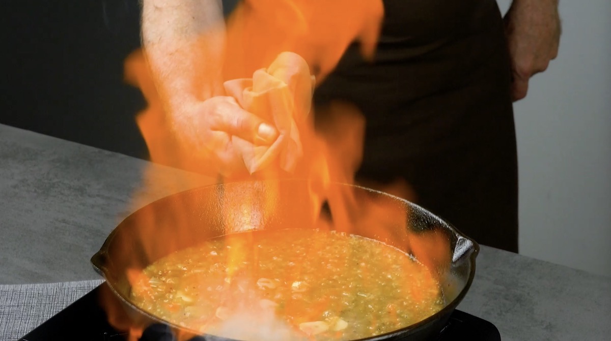 2.) Dünste die Zwiebelwürfel und die kleingeschnittenen Knoblauchzehen in dem heißen Öl an und lösche das Ganze mit Weißwein ab. Für ein besonders starkes Aroma kannst du die Mischung auch noch kurz flambieren.