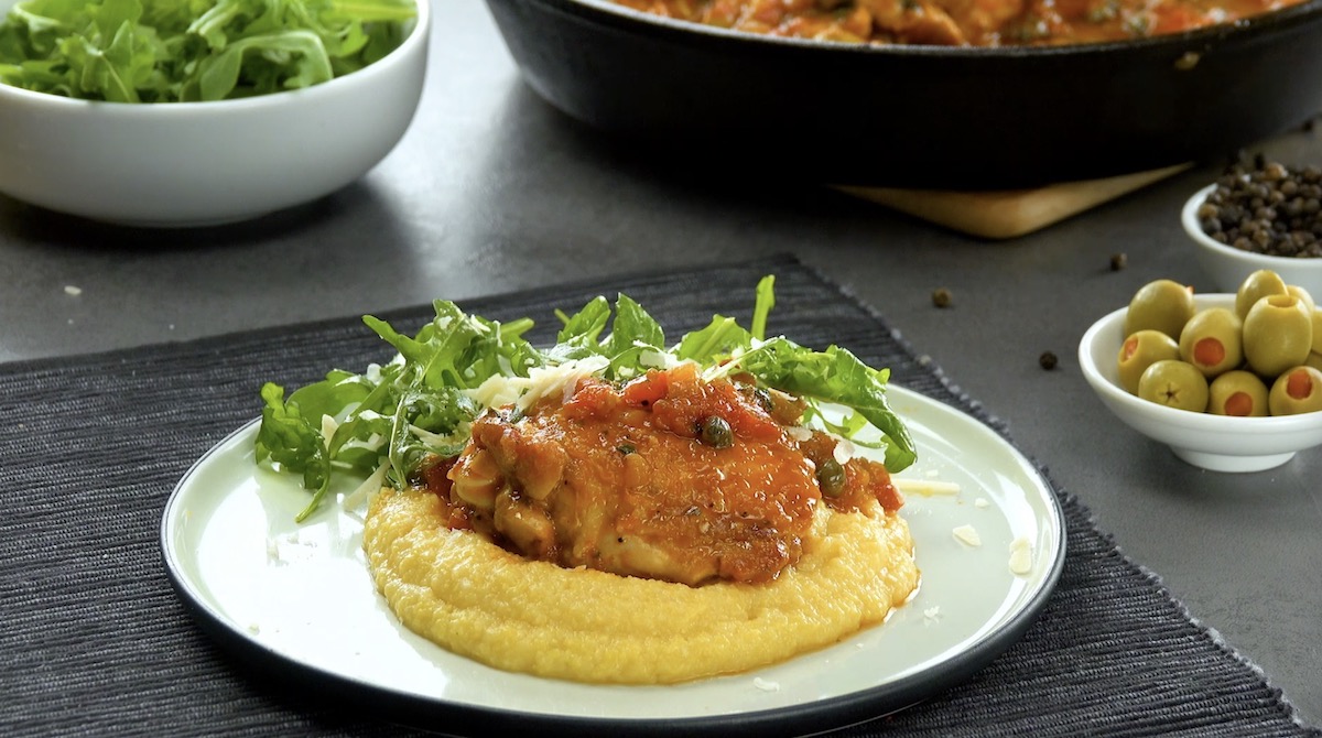 Zarte Hühnerschenkel mit Weißwein & Knoblauch auf würziger Polenta