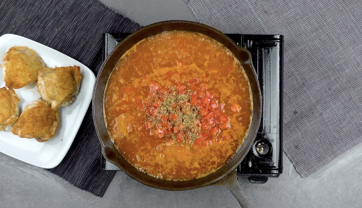 3.) Gib danach auch die Tomatensoße, die Hühnerbrühe, die in Stücke geschnittenen Tomaten und Oregano hinzu und lass die Soße aufkochen.