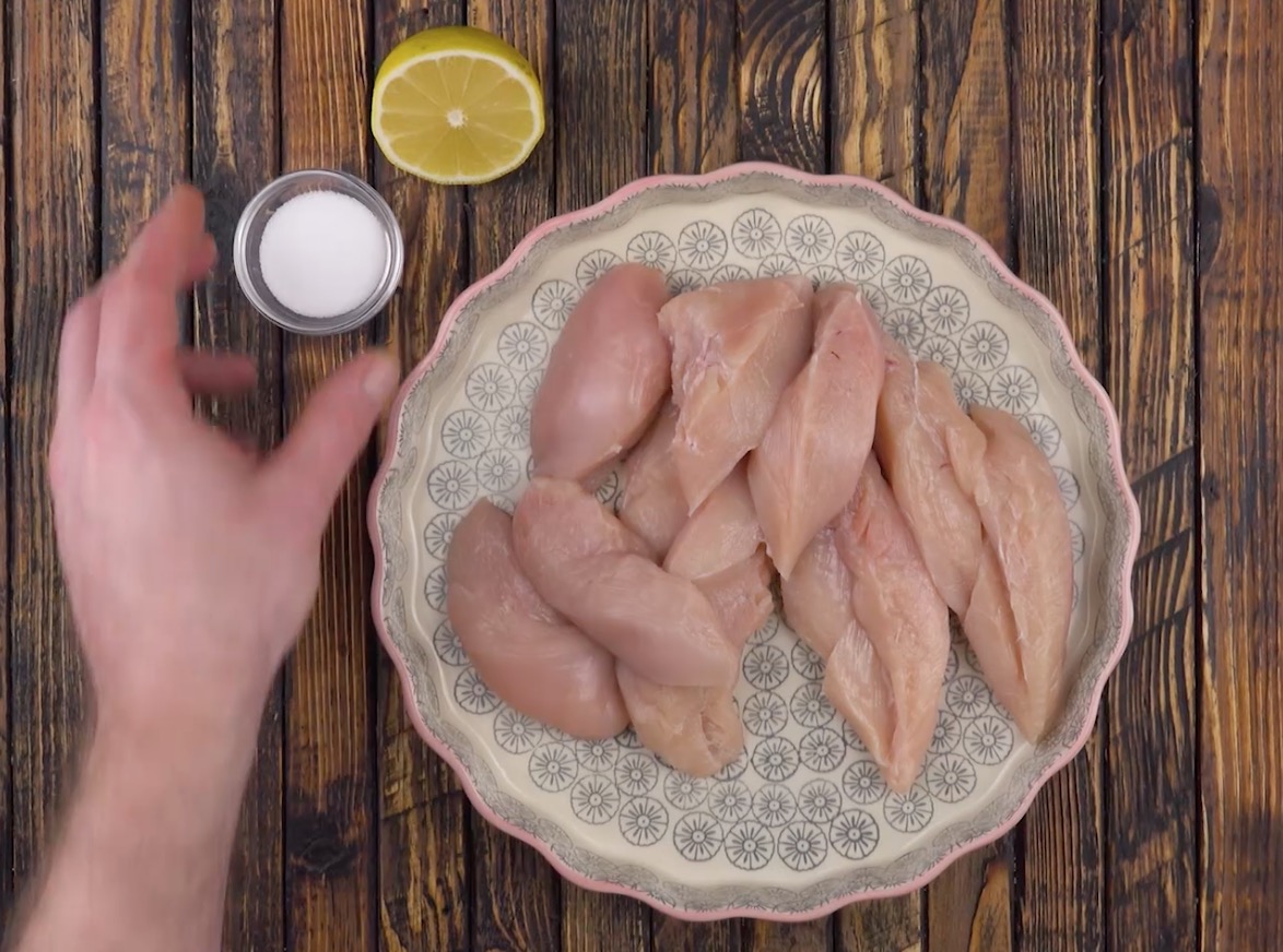 1.) Schneide die Hühnerbruststücke zunächst in dicke Scheiben und reibe sie dann sorgfältig mit Salz und Zitrone ein.