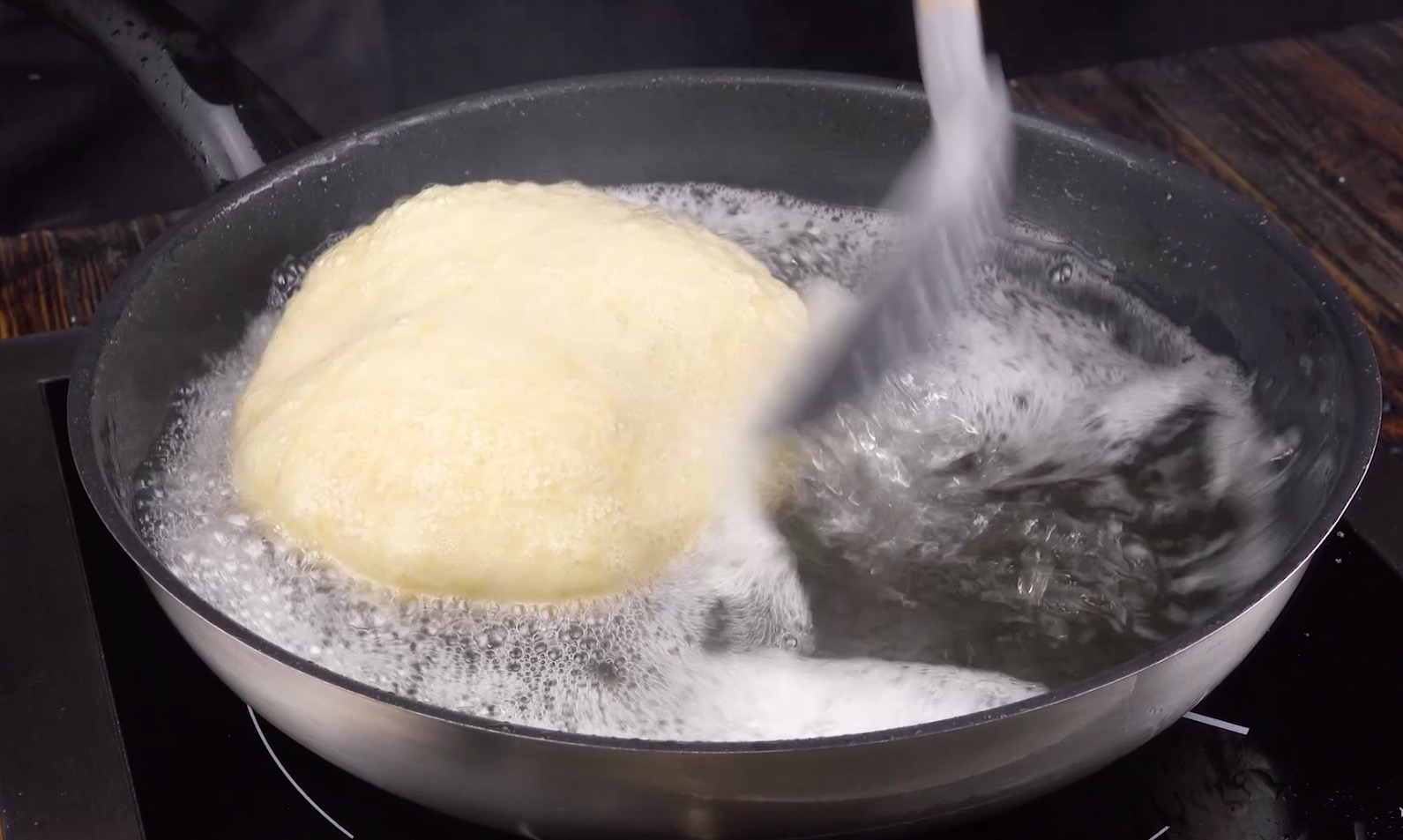 4.) Knete den Hefeteig vor der Weiterverarbeitung nochmal durch und trenne dann ein etwa faustgroßes Stück ab. Walze es auf einer bemehlten Arbeitsfläche etwa kreisrund aus und frittiere es in 210 °C heißem Palmfett, bis es goldbraun ist. Das beste Resultat kannst du erzielen, wenn du das Brot in einem Wok zubereitest und immer wieder mit einer Suppenkelle oder einem Schaumlöffel Fett aufs Brot schöpfst.