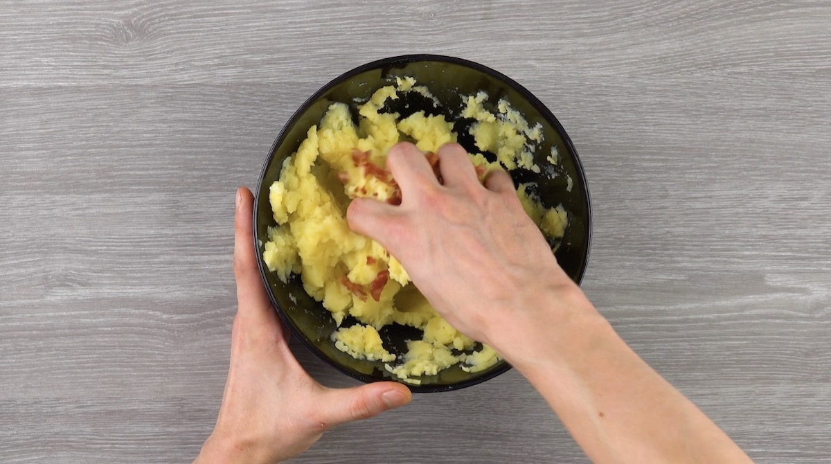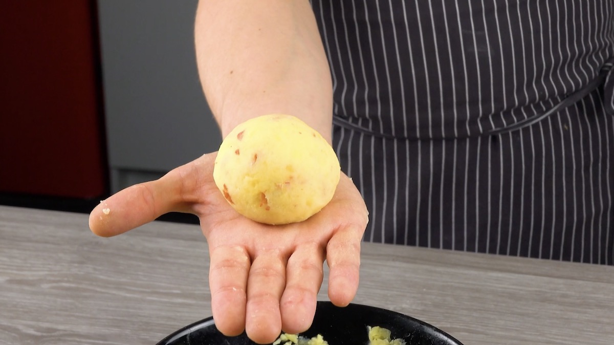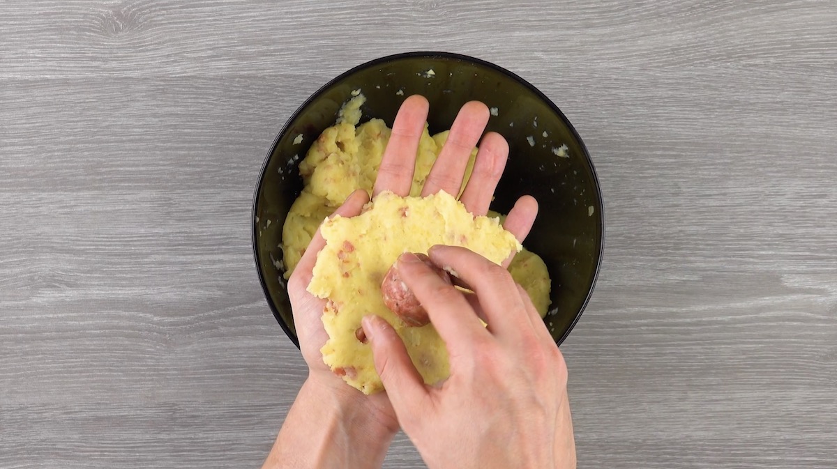 6.) Umhülle das Hackbällchen komplett mit der Kartoffelmasse und rolle das Ganze anschließend zu einer Kugel.