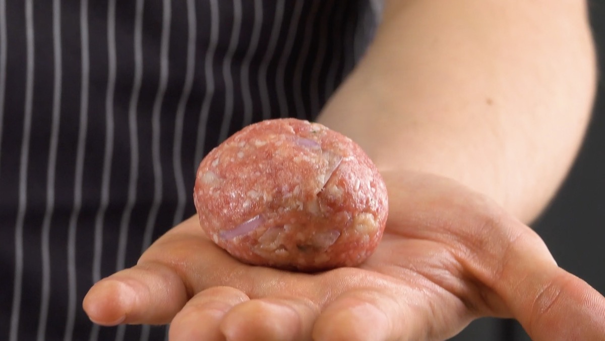 3.) Umhülle den Käsewürfel komplett mit der Hackmasse und rolle diese anschließend zu einer Kugel.