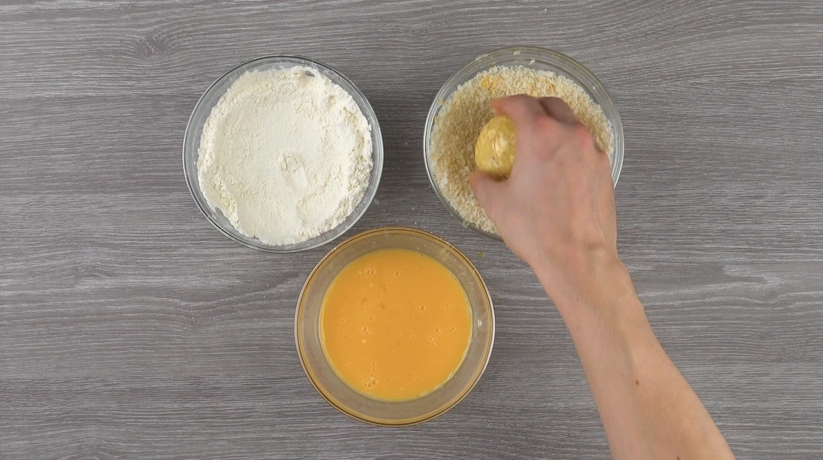 7.) Wälze die gefüllte Kartoffelkugel nun in Mehl, ziehe sie durch verquirltes Ei und rolle sie durch Pankomehl.