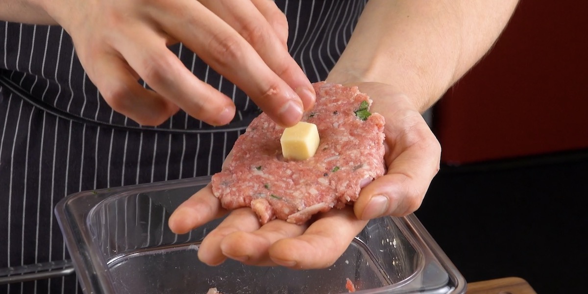 2.) Drücke etwas von der Hackmasse in der Handfläche platt und lege einen Käsewürfel in die Mitte.