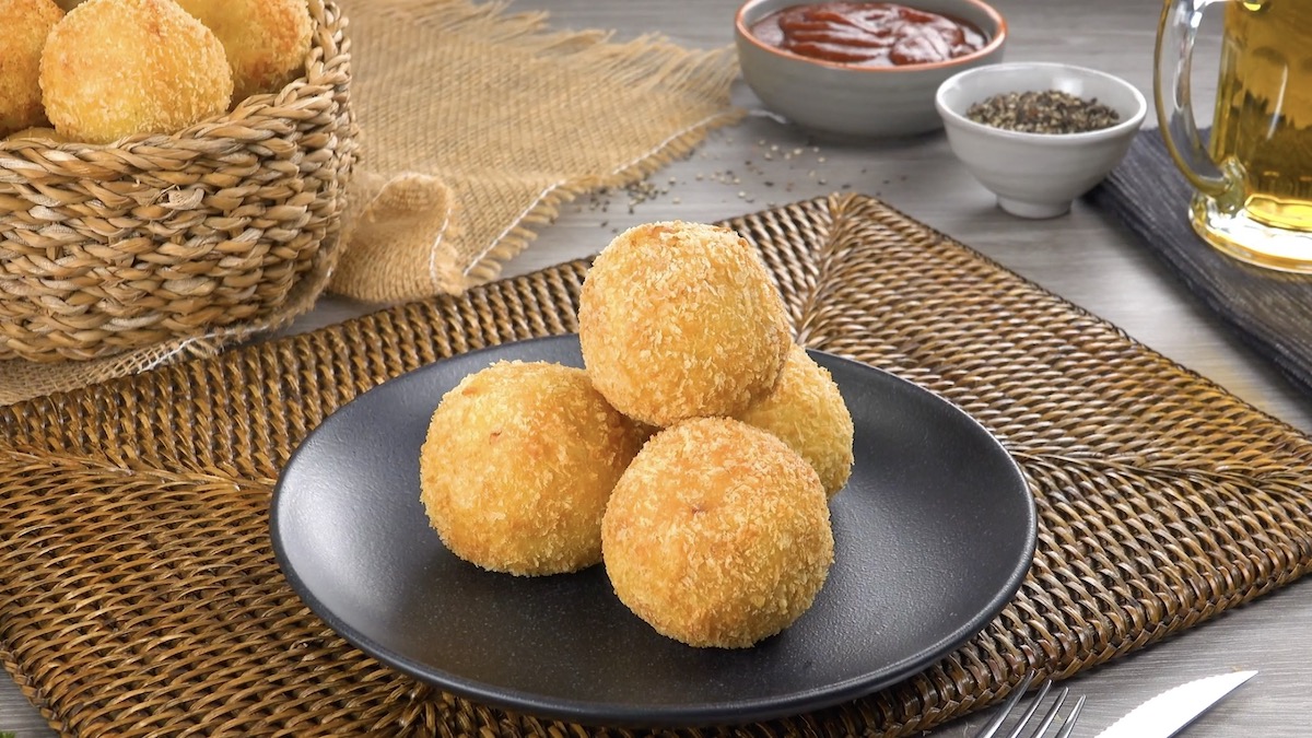 Die Bällchen sehen pur schon zum Anbeißen aus. Spätestens vor dem zweiten Biss solltest du sie jedoch in Ketchup dippen, denn dann werden deine Geschmacksknospen die Harmonie aus Kartoffeln, Hack und Käse auf ein noch höheres Köstlichkeitslevel heben. Übrigens: Das coole Schneidebrett aus dem Video findest du hier.