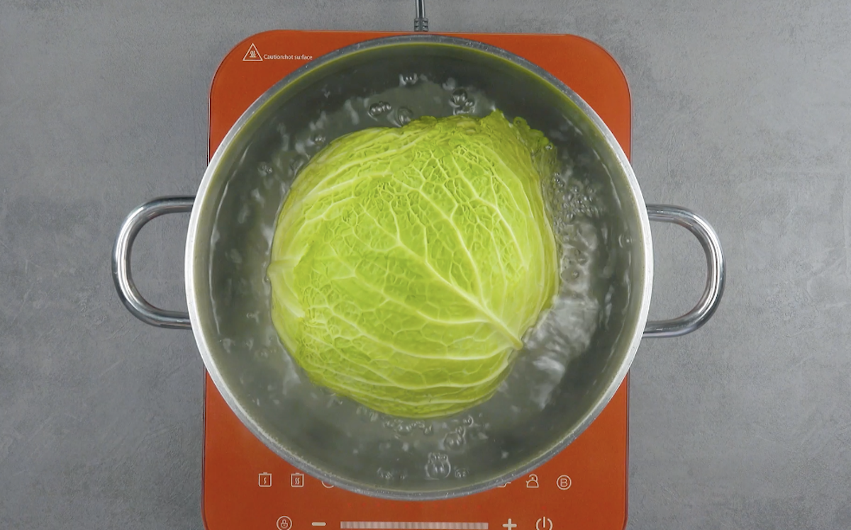 1. Schneide den Wirsing am Strunk ein und blanchiere ihn so lange, bis sich die Blätter langsam vom Strunk lösen. Danach schreckst du den Wirsingkohl am besten in eiskaltem Wasser ab, so behält er seine grüne Farbe und gart nicht weiter. Tupfe die Wirsingblätter mit Küchenpapier ab.