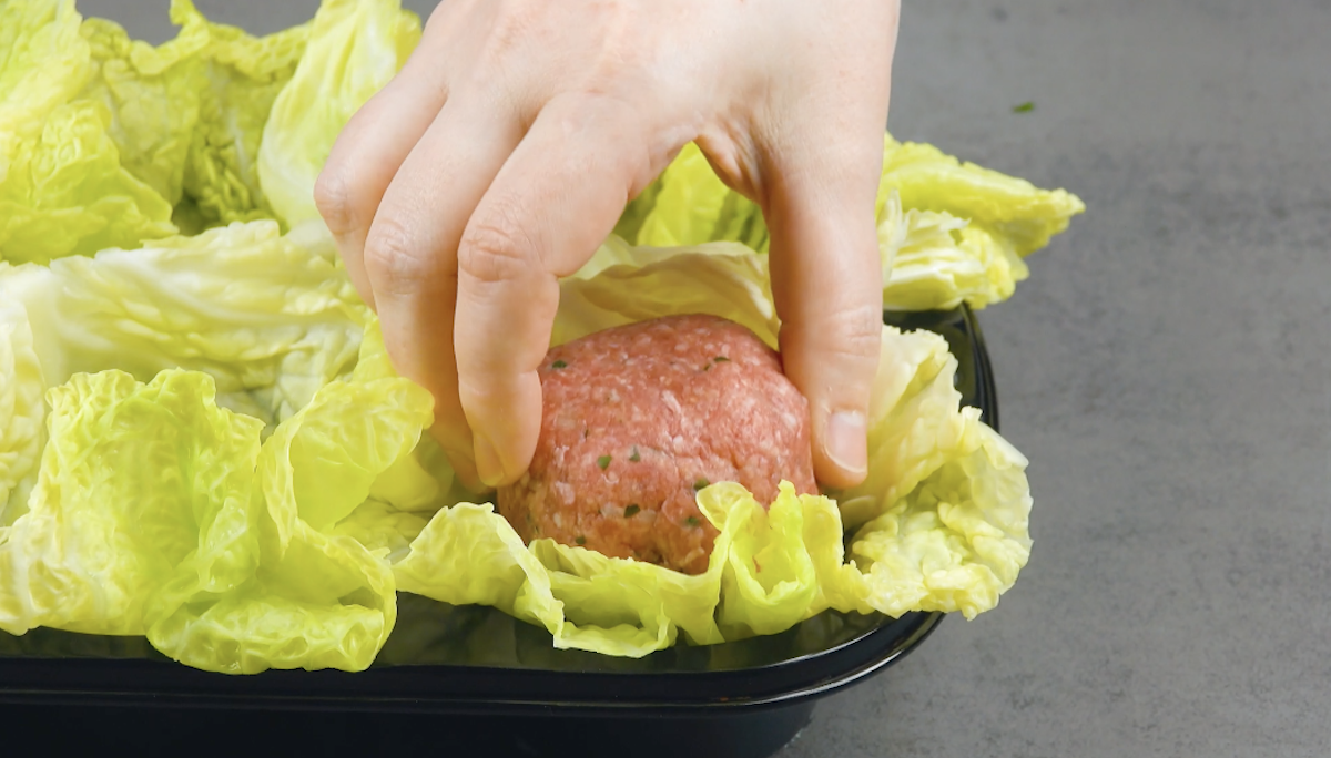 3. Lege die blanchierten Wirsingblätter in eine gefettete Muffinform. In jede Kuhle kommt ein mit Käse gefülltes Hackfleischbällchen.