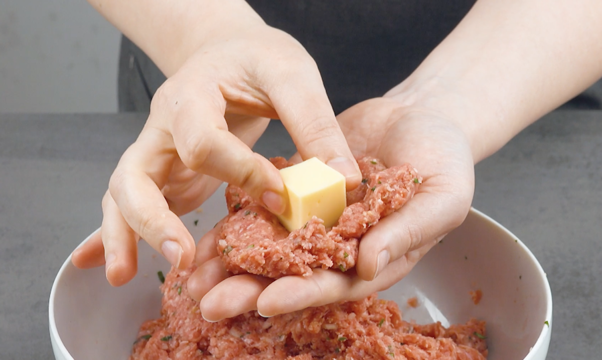 2. Vermische Hackfleisch mit klein gehackter Petersilie, Ei, klein geschnittener Zwiebel und Semmelbrösel und forme mehrere Fladen daraus. Schneide den Käse in Würfel und lege je einen Würfel auf die Hackfleisch-Fladen. Schließe das Hackfleisch nun über den Käsewürfeln und forme Hackbällchen daraus.