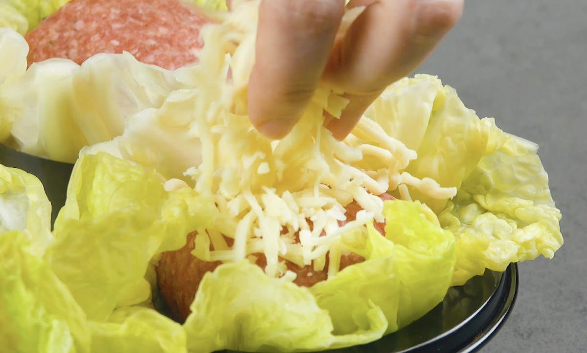 4. Bestreue die Hackfleischbällchen mit geriebenem Käse. Schiebe die Muffinform bei 180 °C Umluft für 20 Minuten in den Ofen.