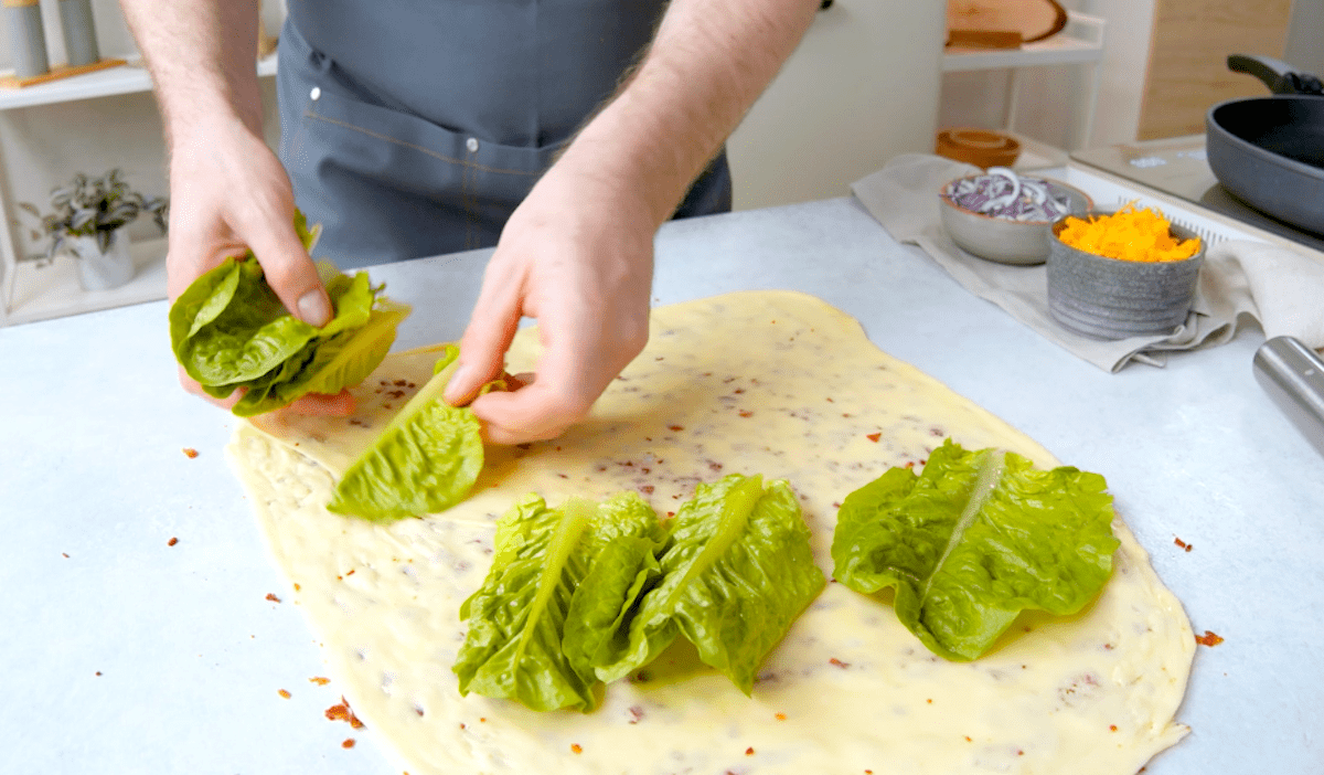 3. Lege auf den ausgerollten Käse Salatblätter.