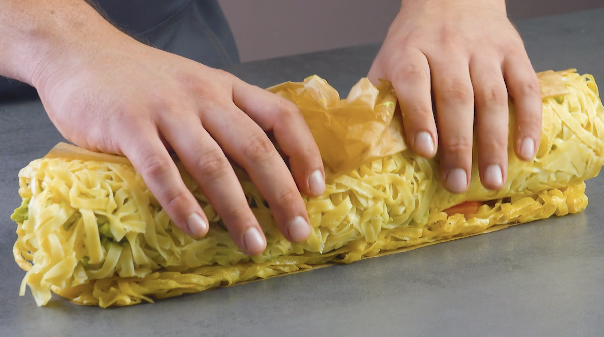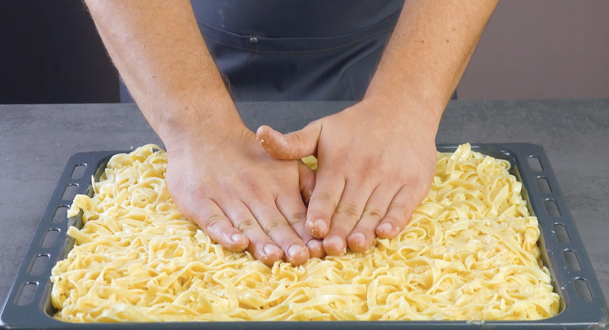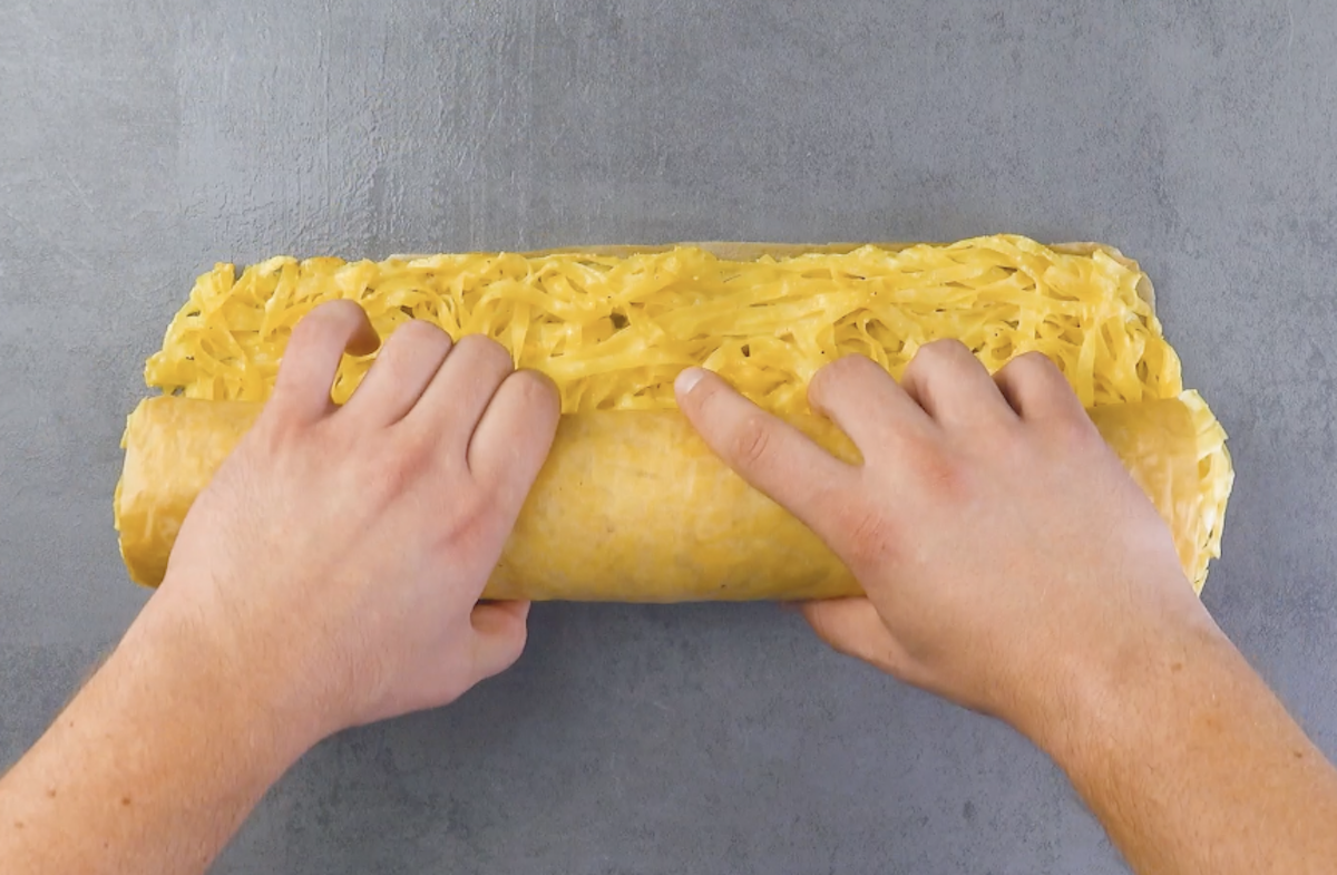 2. Stelle das Blech für 10 Minuten bei 200 °C Umluft in den Ofen. Rolle die Tagliatelle-„Matte“ zusammen, solange sie noch warm ist, und lasse sie auskühlen.