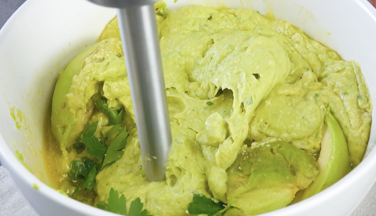 3. Gib Avocado, Knoblauch, Basilikum, Petersilie, Parmesan, Salz und Pfeffer, Öl sowie Saft einer Zitrone in eine Schüssel und püriere alles mit einem Pürierstab zu einer cremigen Masse.