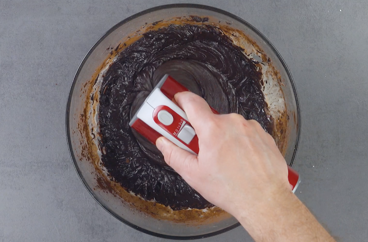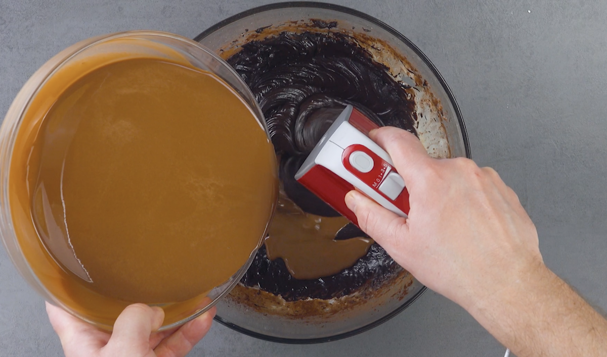 3. Jetzt mischst du nach und nach die Kuvertüre-Kokosfett-Mischung unter.