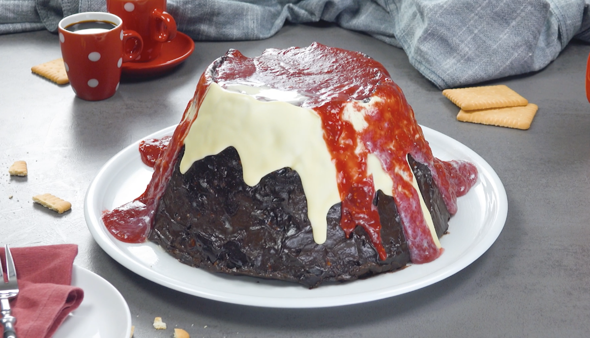 Einen weiteren essbaren Vulkan findest du hier: Kokoskuchen mit cremiger Füllung.