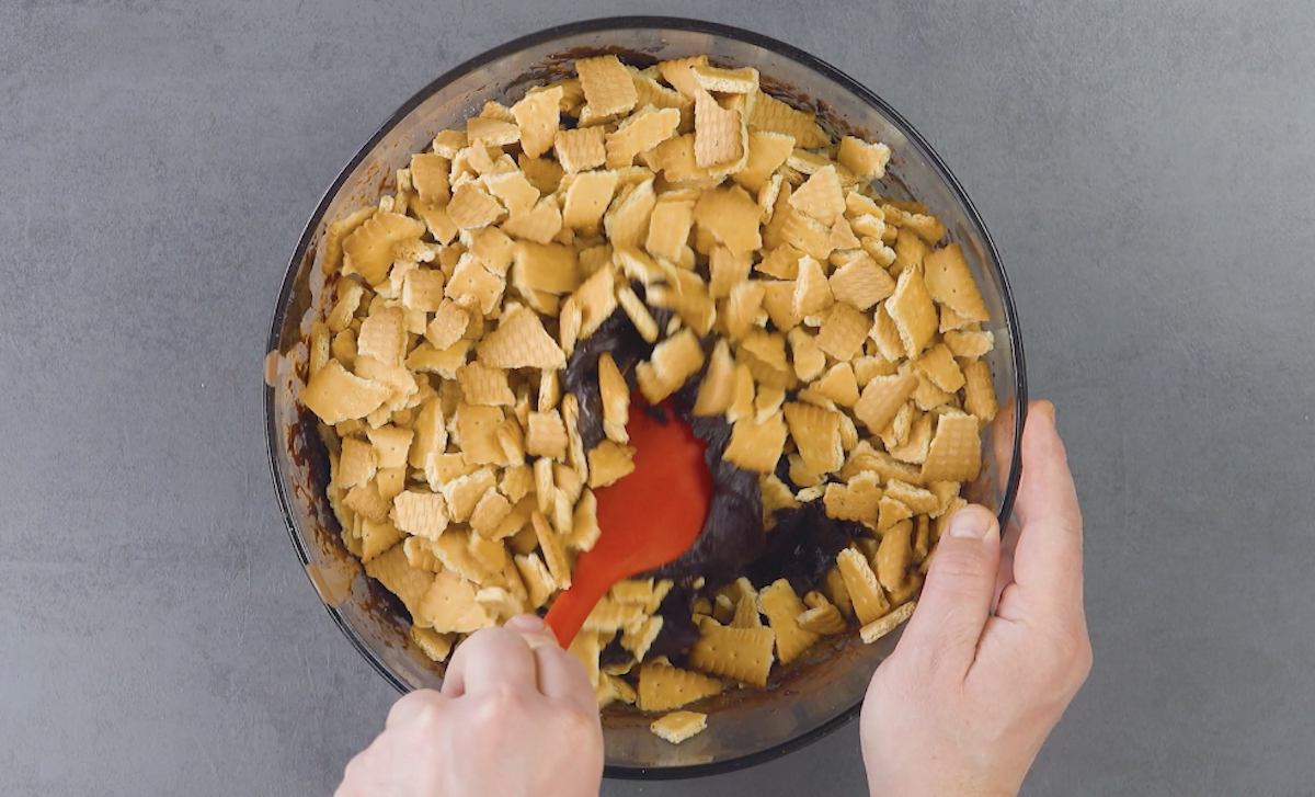 4. Zerkleinere Butterkekse grob mit deinen Händen und gib sie in die Schüssel hinzu. Verrühre alles miteinander.