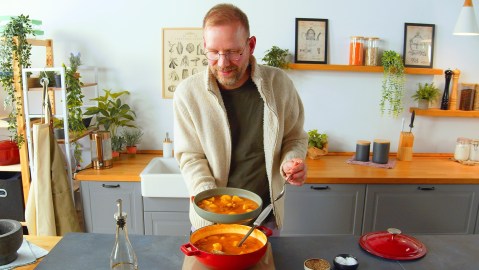 Möchtest du den Eintopf unseres Kochs Oli nachkochen, dann brauchst du lediglich mehligkochende Kartoffeln, Chorizo, eine große Zwiebel, etwas geräuchertes Paprikapulver, Brühe sowie Salz und Pfeffer und einen großen Topf 🛒. Folge der Schritt-für-Schritt-Anleitung im Video, um den Eintopf zuzubereiten. Übrigens: Magst du es noch ein wenig pikanter, dann kannst du beim Kochen noch ein paar Chiliflocken hinzufügen.