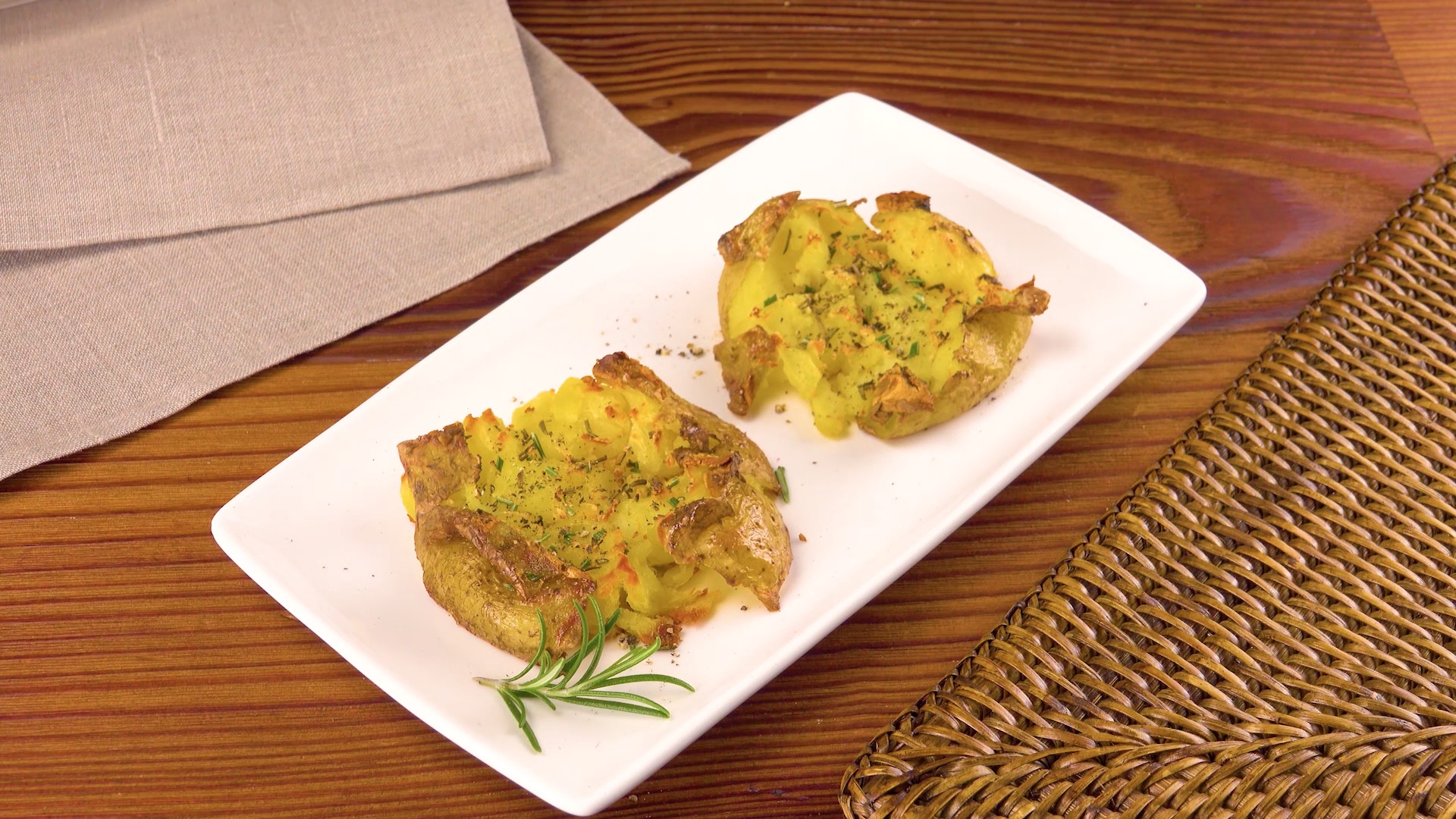 3. Verfeinere die zerdrückten Kartoffeln mit Olivenöl, Salz und Pfeffer sowie Rosmarin und backe sie 15 Minuten lang bei 200 °C Ober- und Unterhitze im vorgeheizten Ofen. Serviere die Faustschlag-Kartoffeln anschließend mit einem Klecks Crème fraîche.