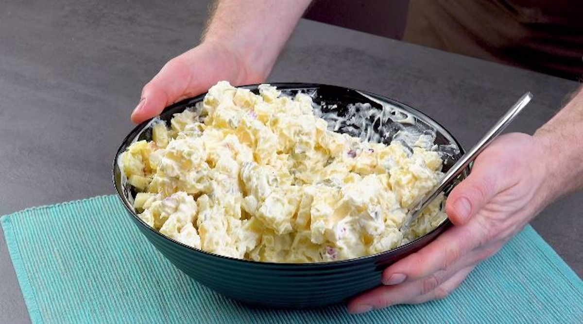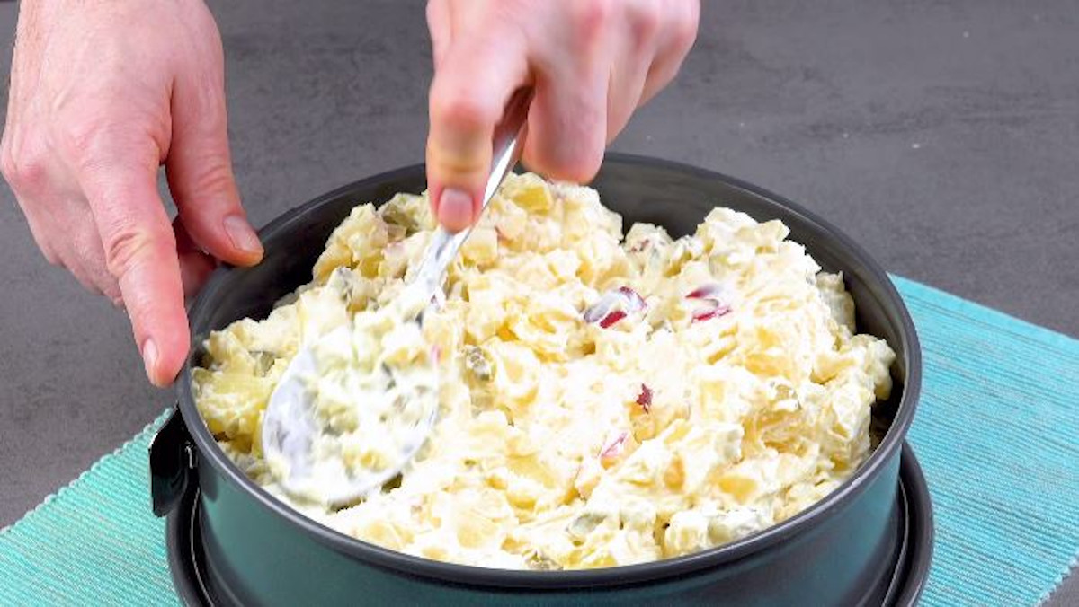 2.3) Fülle den Kartoffelsalat in eine Springform und stelle ihn anschließend für mindestens eine Stunde, besser über Nacht, in den Kühlschrank.
