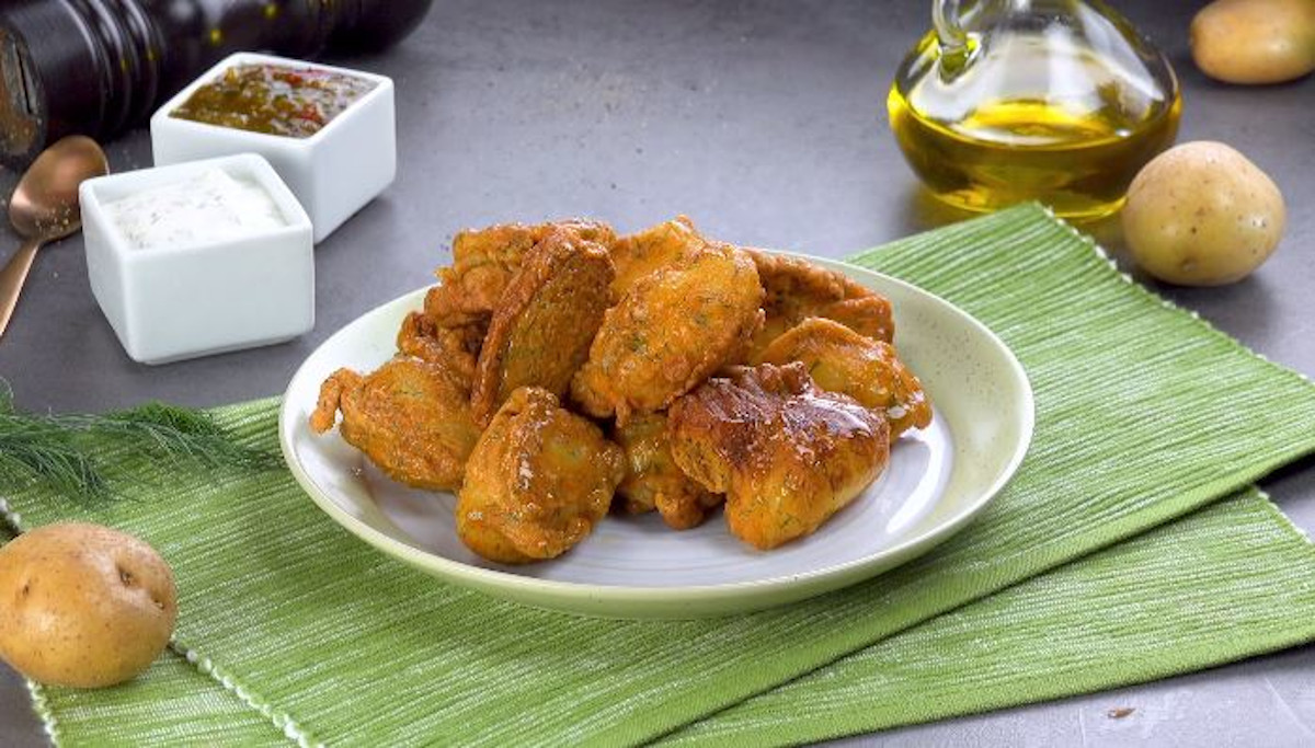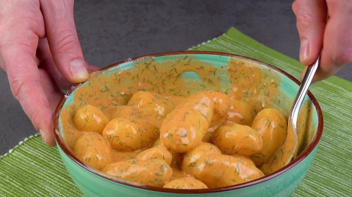 3.1) Koche die Kartoffeln in Salzwasser und pelle sie anschließend. Verrühre dann die Eier mit Joghurt, Mehl, Paprikapulver, Dill und Salz. Hebe dann die Kartoffeln unter.