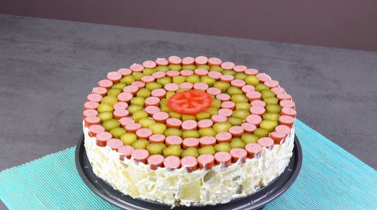 2.4) Schneide die Würstchen und die restlichen Gewürzgurken in Scheiben und dekoriere mit ihnen und mit einer Scheibe Tomate den Kartoffelsalat-Kuchen. Löse ihn anschließend vorsichtig aus der Springform und serviere ihn.