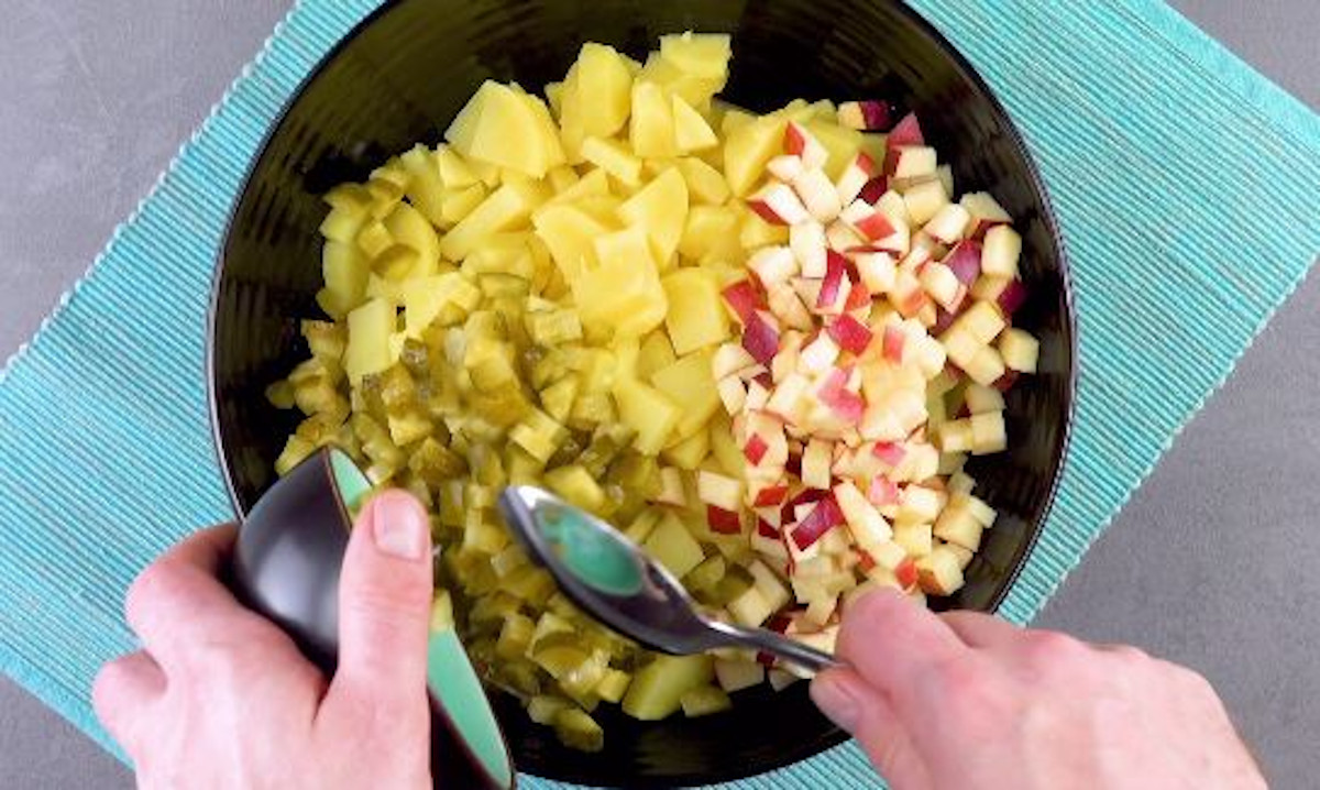2.1) Koche die Kartoffeln in Salzwasser, pelle sie anschließend und schneide sie in Würfel. Schneide auch die Äpfel, die Zwiebel und etwa die Hälfte der Gewürzgurken ebenfalls in kleine Stücke und gib alles zusammen in eine Schüssel.