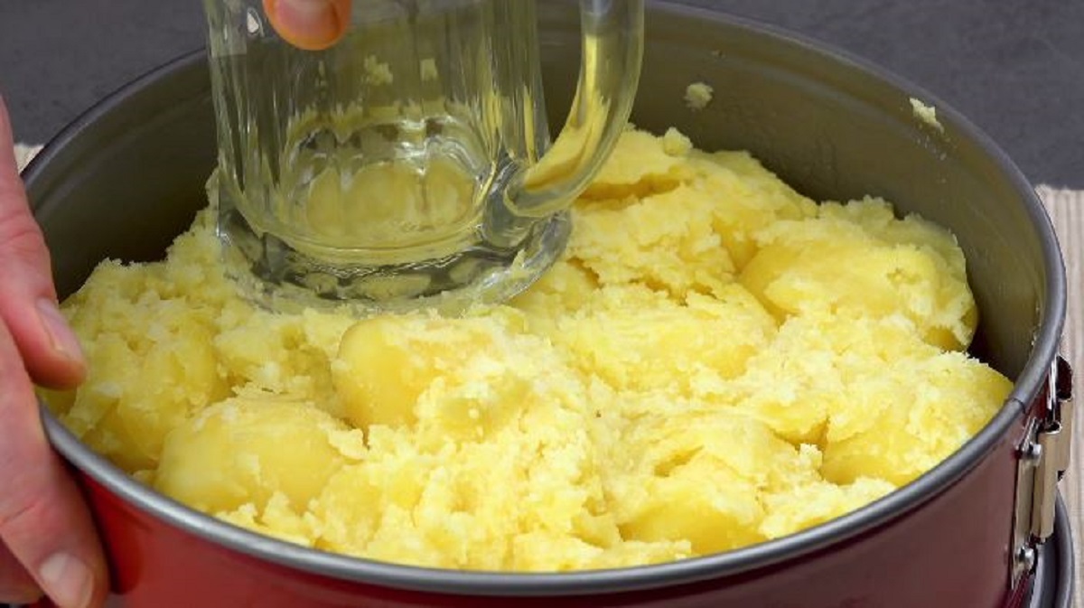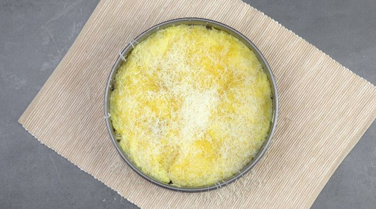 1.1) Koche die Kartoffeln in Salzwasser und pelle sie anschließend. Fette eine Springform mit Butter ein. Gib dann die Kartoffeln in die Form und drücke sie mit einem Glas an.