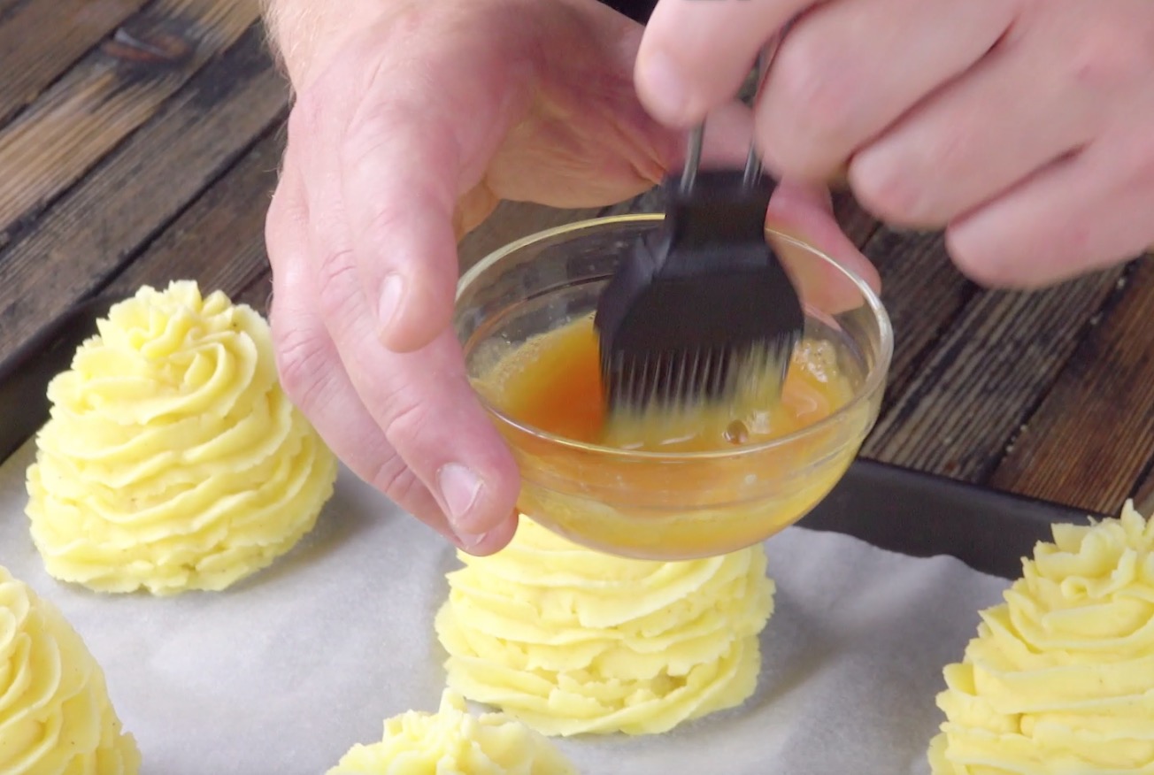 4.) Spritze einen Püreekreis auf ein mit Backpapier ausgelegtes Backblech. Darauf kommt ein Soßeneiswürfel. Spritze nun wiederum Kartoffelpüree darum herum und darauf, bis ein Türmchen entsteht.